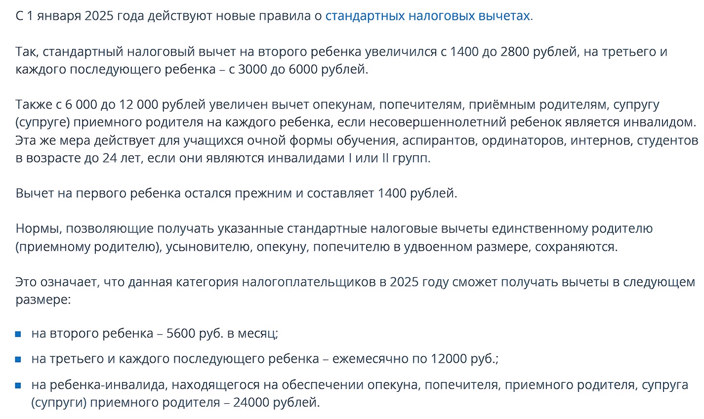 С 2025 года повышены суммы детских стандартных вычетов и увеличен лимит дохода, после которого вычеты не предоставляются. Вычет будет применяться до предельного порога дохода с начала года в 450 000 рублей.
