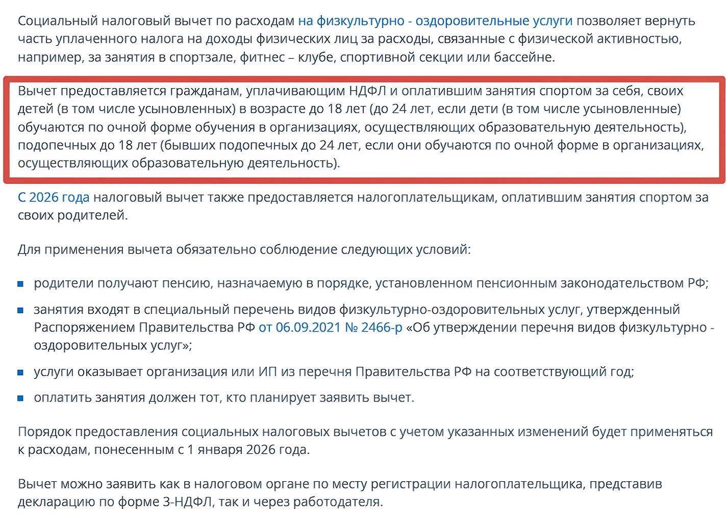 Общий лимит социальных вычетов — 150 тысяч рублей. С 2026 года в вычет можно включать расходы на физкультурно‑оздоровительные услуги для пожилых родителей налогоплательщика.
