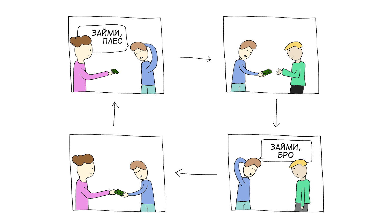 ? Тревожный звоночек. Саша говорит, что первым тревожным звоночком для него стала ситуация, когда им приходилось занимать деньги у одних людей, чтобы отдать долги другим людям, и иметь возможность через 2-3 недели у них же перезанять и отдать первым.