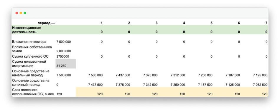 Если бизнес похож на ресторанный и подразумевает ремонт арендуемых помещений или их покупку, в финмодели нужно добавить блок инвестиционных расходов. В него заносят все траты на обустройство помещений и покупку оборудования. В этом блоке будет видно, сколько основных средств приобрела компания для выхода на новый рынок и сколько они будут стоить с течением времени.