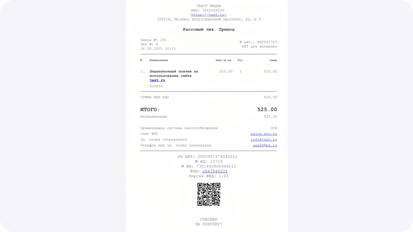 Электронный чек отправляется на email покупателя. Должен содержать QR-код. Сохраняет все фискальные признаки.