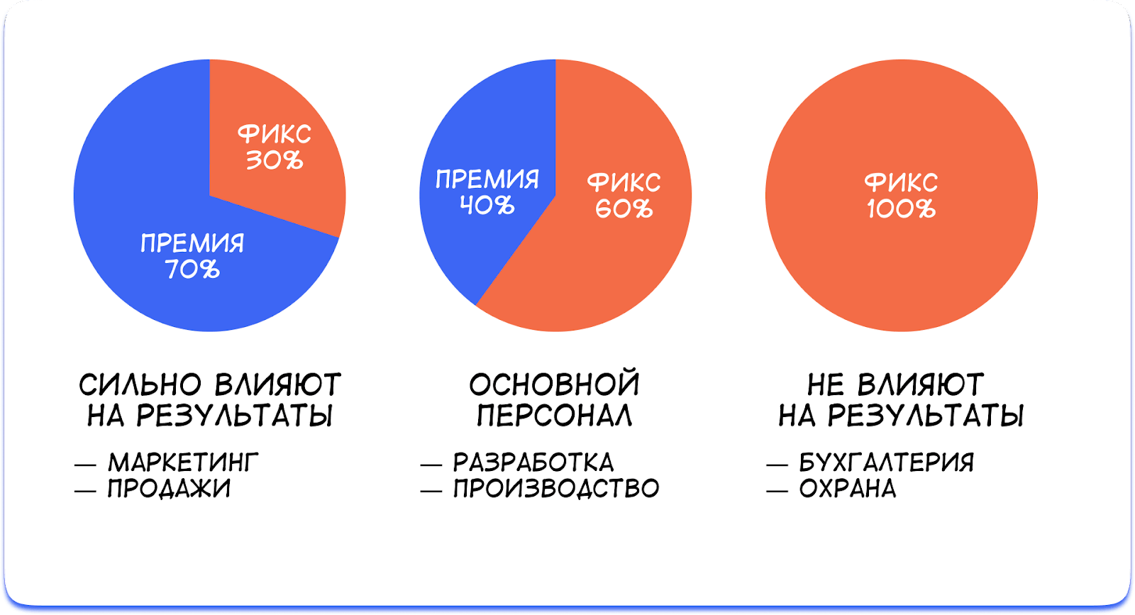Правило 3. Тем, кто не влияет на показатели компании, — оклад. Обычно это вспомогательный персонал: администраторы, секретари, юристы, бухгалтеры, охранники и уборщики. Чтобы избежать постоянной текучки, таким сотрудникам платят стабильный оклад. А если бизнес хочет дополнительно мотивировать этих сотрудников, может выдать премии — например, всем в конце года какой-то процент от оклада.