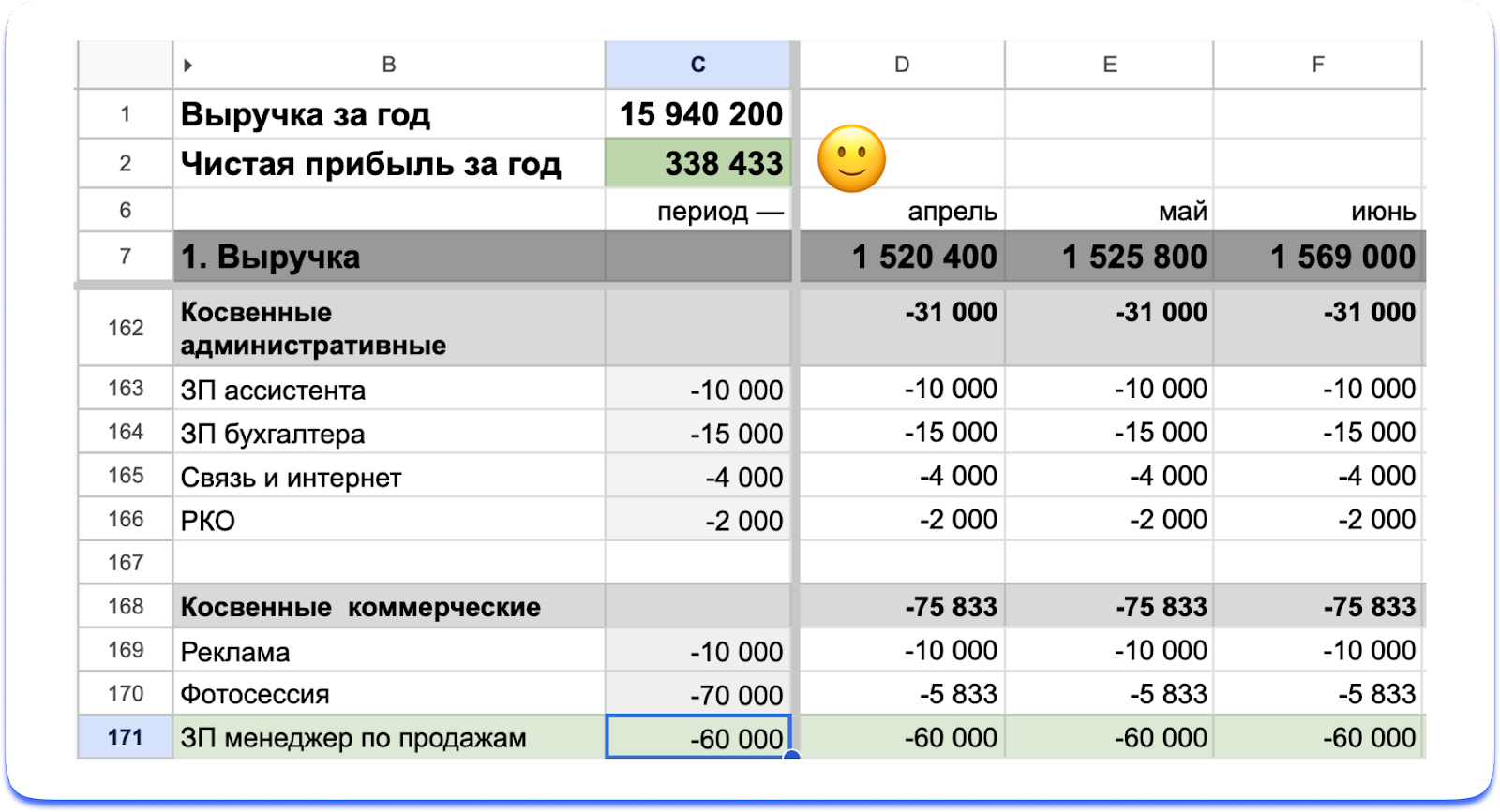 С расчетами для выбора системы оплаты поможет финмодель — инструмент для проверки гипотез. Чтобы проверить, нужно подставить в строку для зарплаты новое значение — зарплату за месяц на определенной должности — и посмотреть, как изменится прибыль.