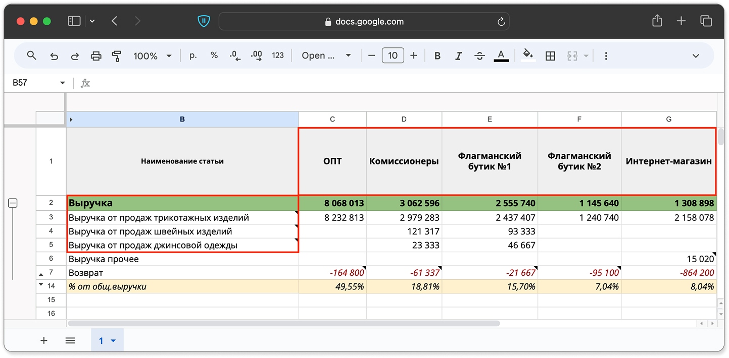В нашем примере выручка разделяется по направлениям и торговым точкам: