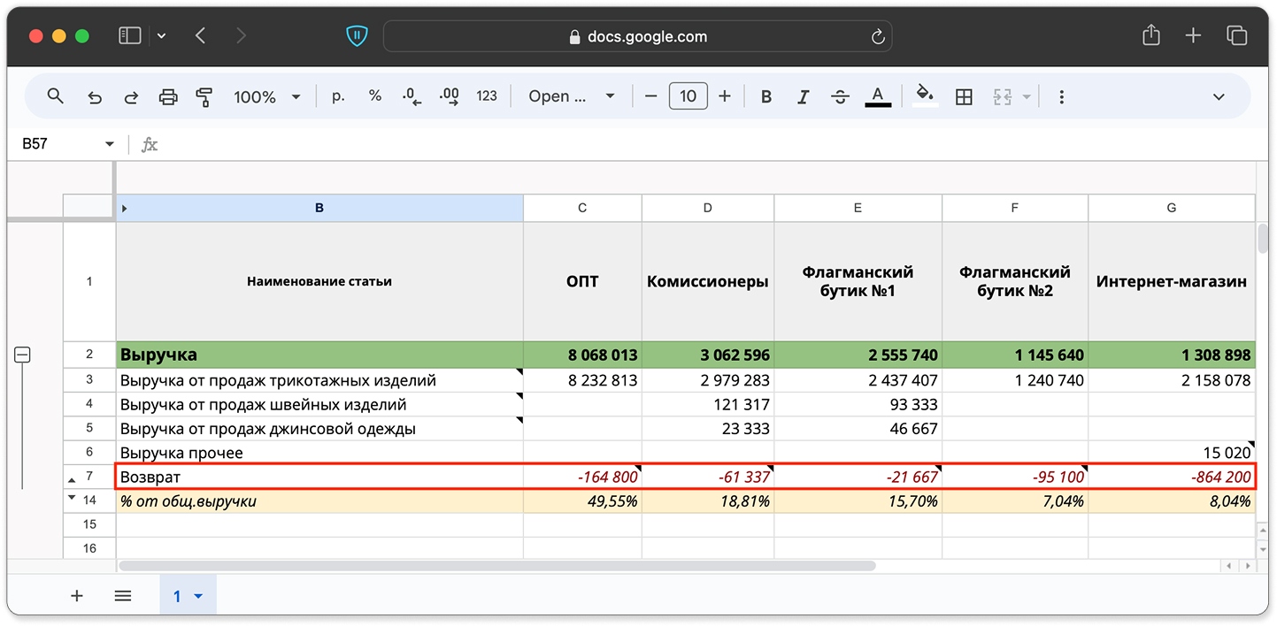 Если формат бизнеса предполагает возвраты от клиентов, их также важно указать в разделе «Выручка». Это нужно, чтобы не исказить финансовый результат, потому что возвраты могут сильно уменьшать итоговую сумму выручки. Плюс так удобно отслеживать, у каких товаров и по каким направлениям какой процент возврата — и влиять на него.
