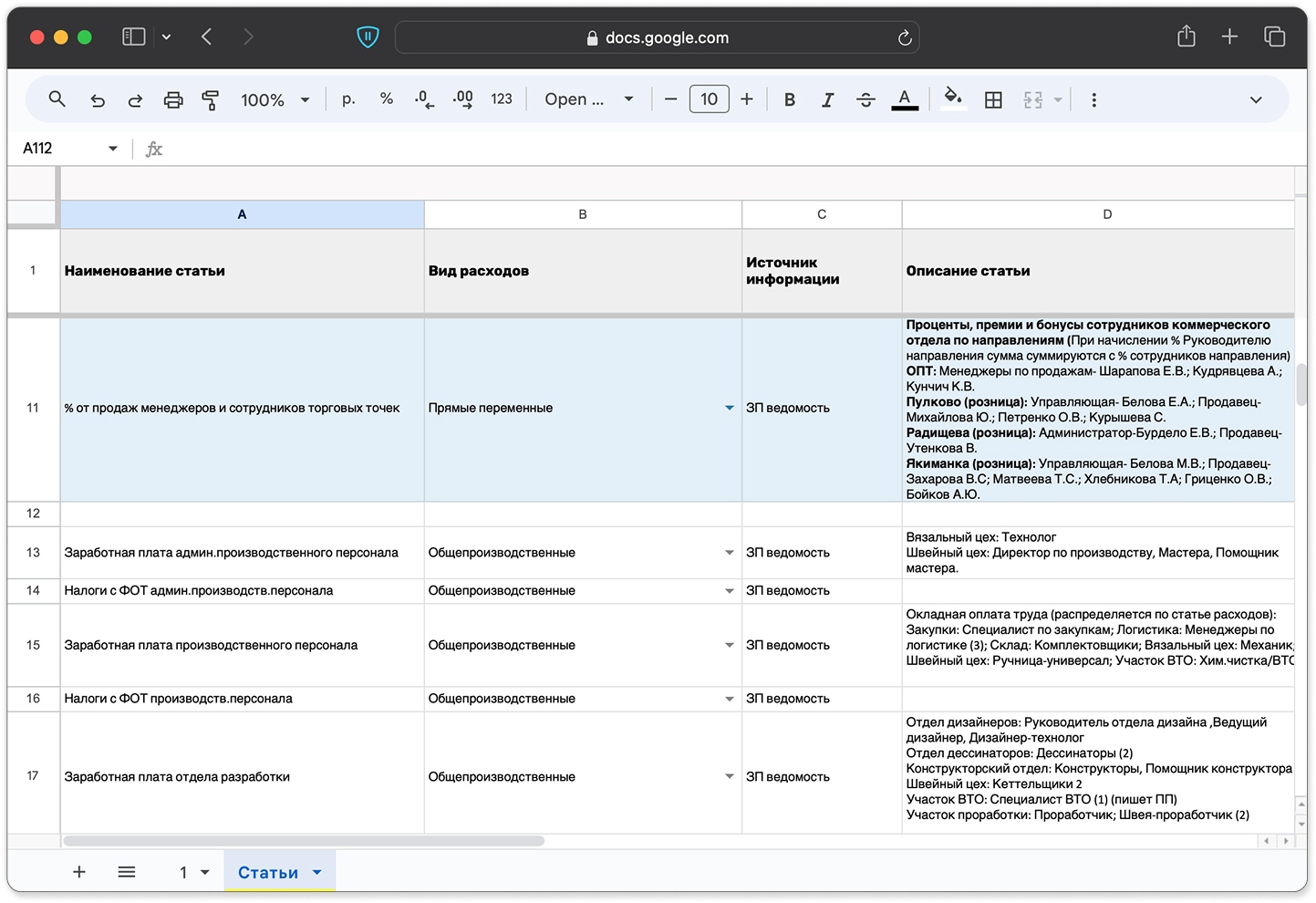 описание статьи — что именно входит в её состав. Например, в фонд оплаты труда производственного персонала входят зарплаты технолога, мастера, помощника мастера, НДФЛ и отчисления в соцфонды.