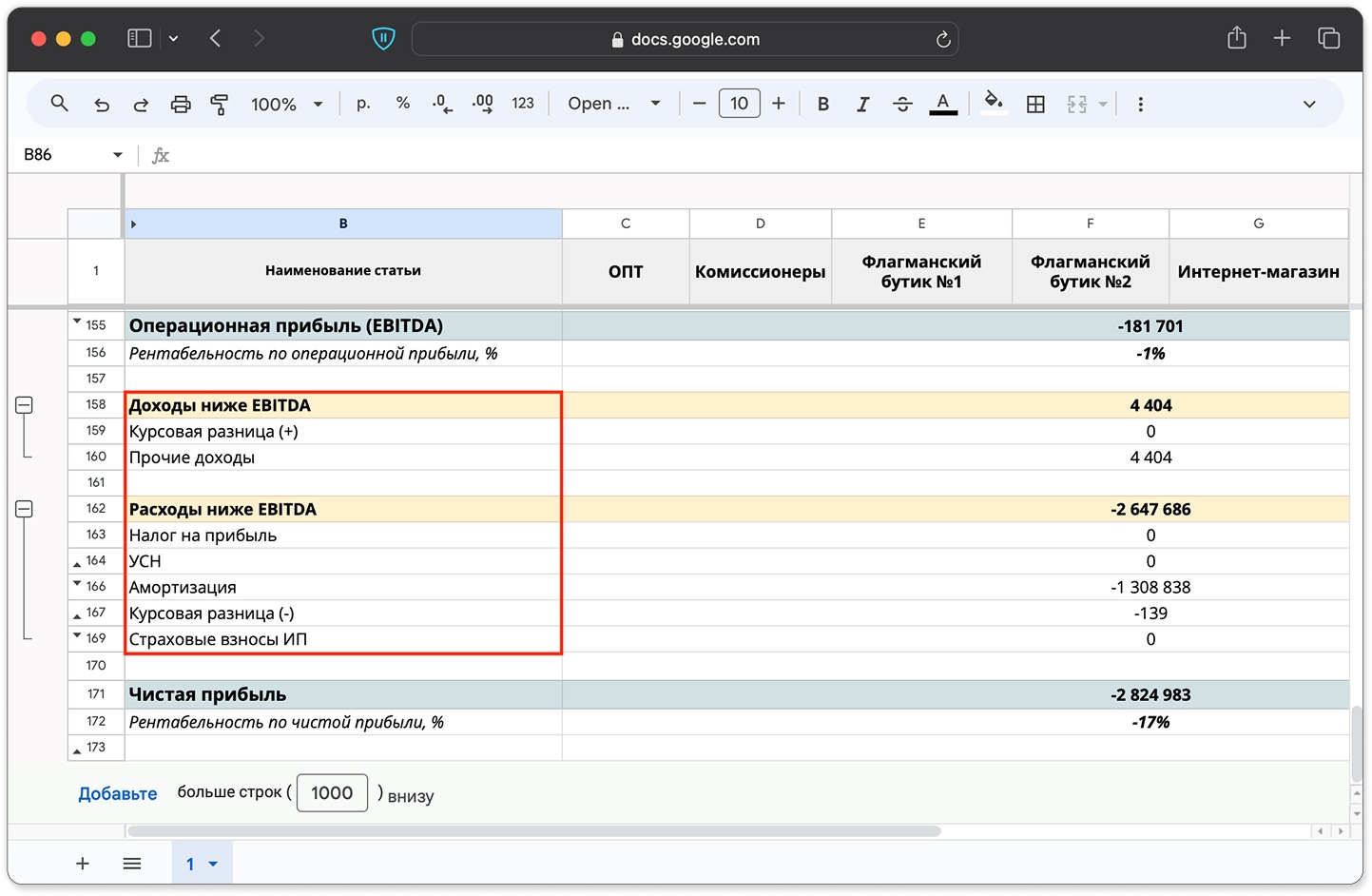 Шаг 5. Детализировать доходы и расходы ниже операционной прибыли (EBITDA). Чтобы узнать размер чистой прибыли, нужно указать дополнительные доходы и расходы, которые в ОПиУ идут ниже операционной прибыли, или EBITDA. К таким доходам обычно относятся пересчет разницы курса и прочие поступления — проценты по депозитам, деньги от сдачи в аренду помещения и всё то, что не связано с основной деятельностью.К расходам ниже EBITDA относятся:
