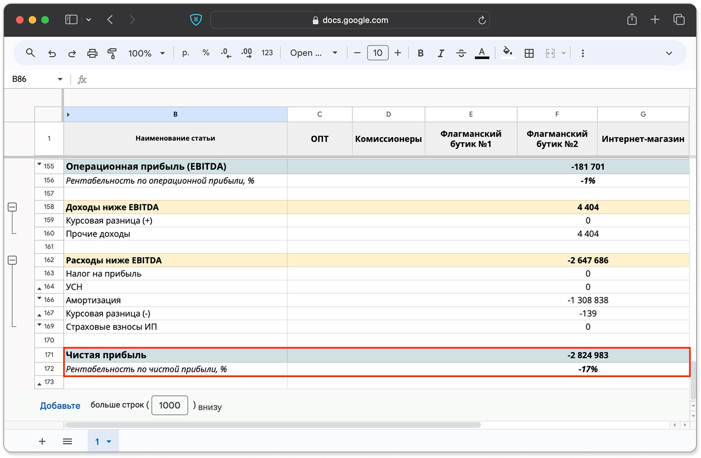 → Чистая прибыль и рентабельность по чистой прибыли — это выручка минус все расходы компании. Чистая прибыль — это финальный результат работы компании. Если чистая прибыль и рентабельность по ней минусовые — компания ничего не заработала. Но это не означает, что собственник ничего не получил, — если он работает в операционке, у него есть своя зарплата.