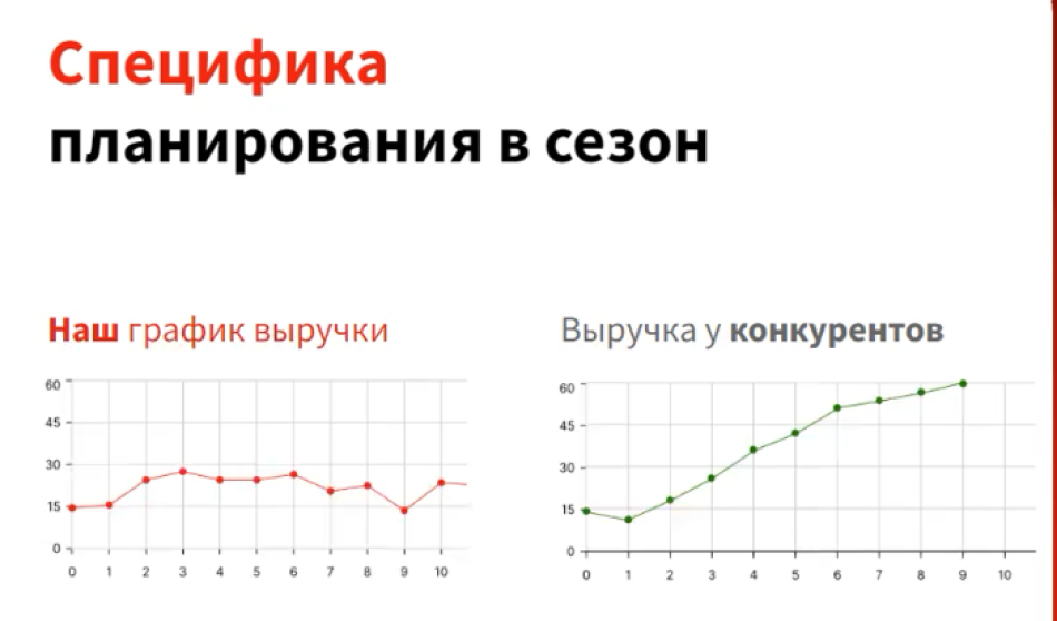 Если график конкурентов уверенно растет в сезон, а график ваших продаж колеблется по прямой, это повод углубиться в аналитику. Либо компания не была подготовлена к сезону и просто не хватило товара или рук, либо был провал со стороны операционки