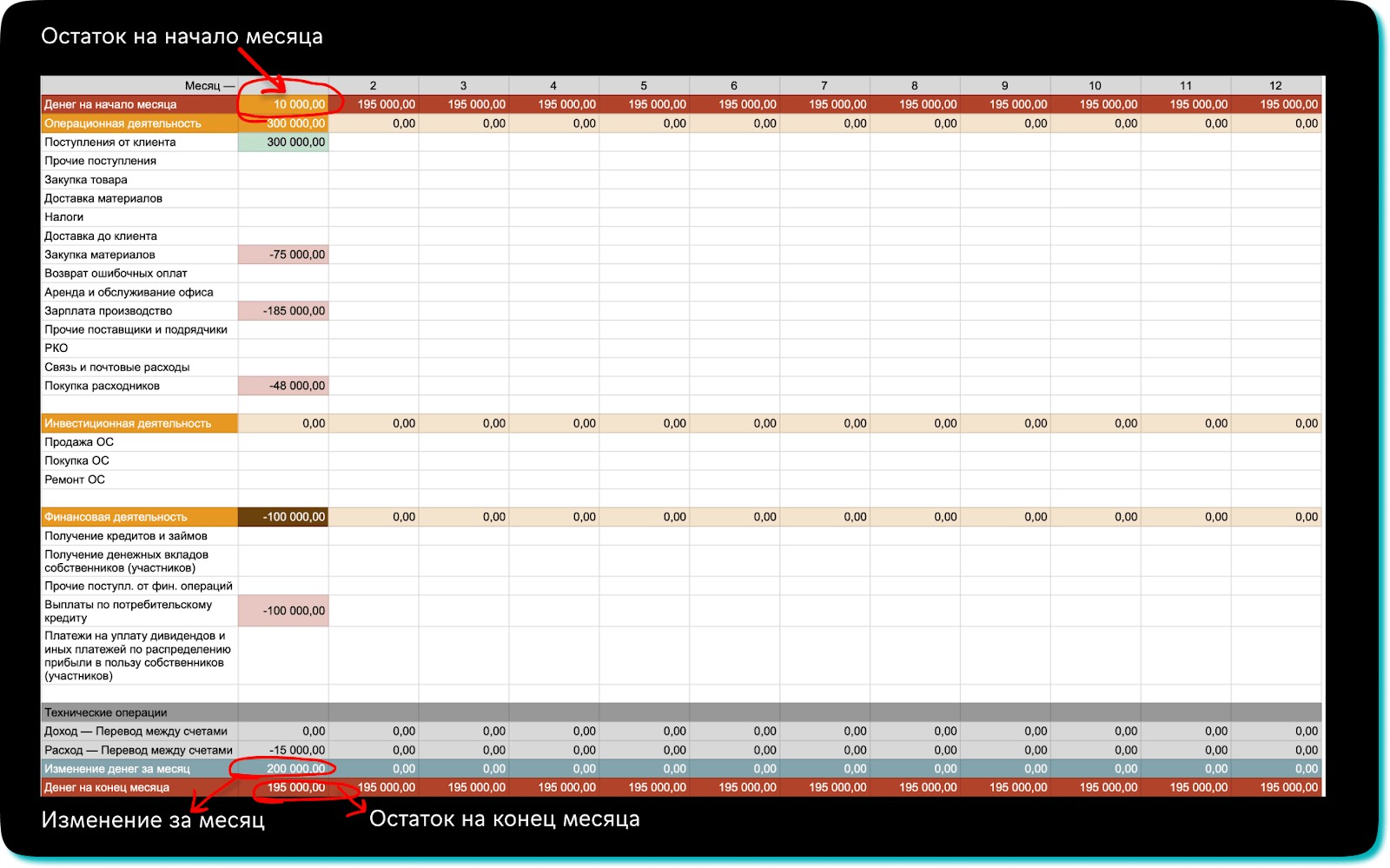 - Остаток на начало периода, например, на 1 число. Сколько денег у компании есть на всех счетах, картах, депозитах на начало месяца.