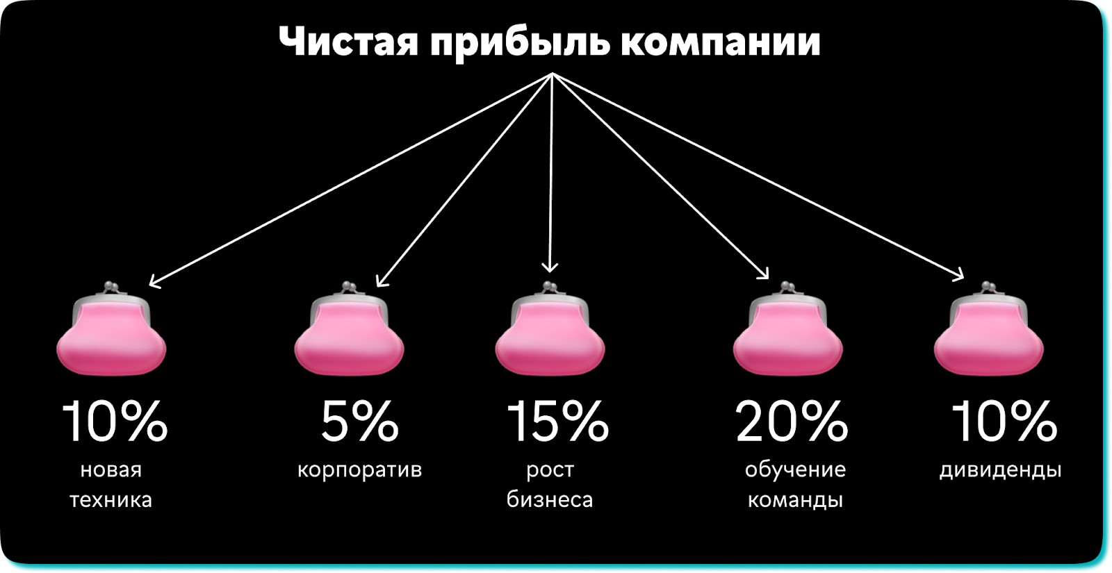 - Если прибыли нет, увы, распределять нечего. Если же есть, решить, на какие цели хотите ее использовать. Цели могут быть самыми разными: от закупки нового оборудования и повышения квалификации сотрудников до легендарного корпоратива.