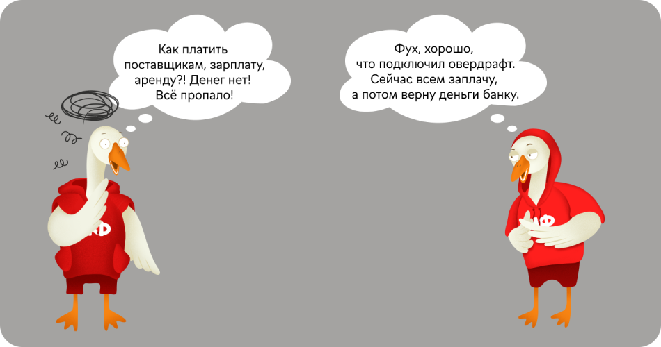 Возникли непредвиденные расходы. Магазин затопило, и в помещении нужно срочно делать косметический ремонт. Борис не готов к неожиданному ремонту: на расчетном счете нет запасных денег, все средства уйдут на регулярные выплаты. Он может подождать две недели, накопить — сделать ремонт. Но тогда будет спад продаж, уйдут клиенты. А может просто взять овердрафт.