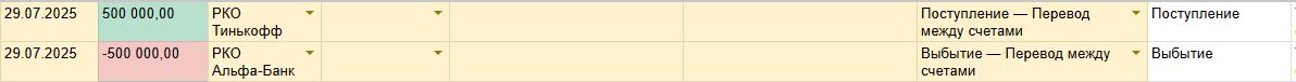 Ключевой момент: эти две строки гасят друг друга в сводном ДДС. С одного счета ушло, на другой пришло. Общая сумма денежных потоков компании не изменилась.