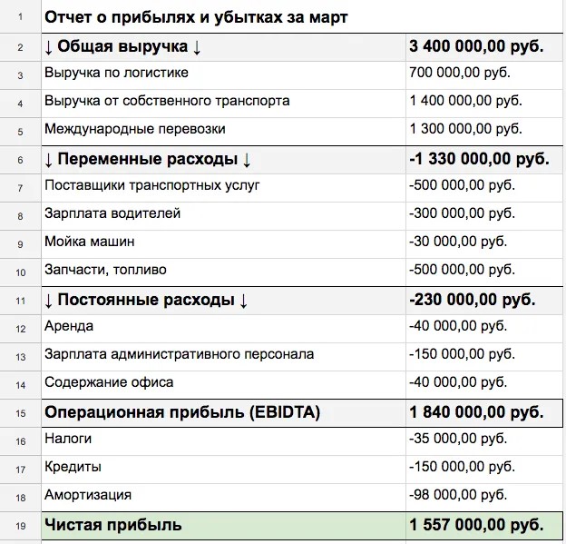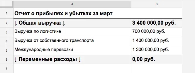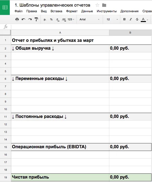 Отчет о прибылях и убытках в Эксель (гугл-докс)