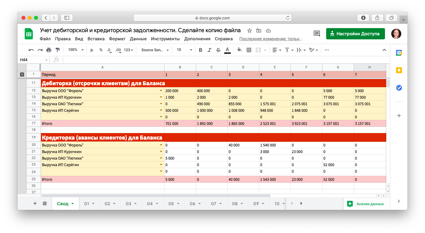 В таблицу для учета дебиторской и кредиторской задолженности записываем по месяцам: кто и сколько денег должен нам — это дебиторка, и кому должны мы — кредиторка