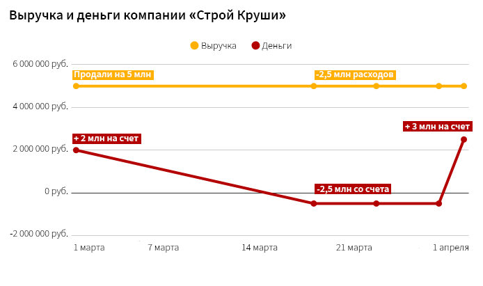 С момента, когда «Строй Круши» оплатила свои расходы: зарплаты, материалы, аренды и до момента, пока она не получила отсроченный платеж, прибыль у нее есть, а денег нет. Проще говоря, с середины марта до начала апреля компания сидит в минусе по деньгам