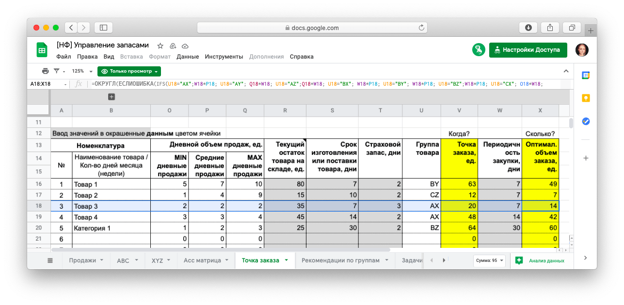 А отслеживать оборачиваемость товаров и следить за запасами поможет табличка «Управление запасами» — в ней есть данные о том, сколько товаров лежит на складе, когда какой товар нужно докупать и в каком объеме. Здесь вы сможете рассчитывать, сколько нужно закупать товаров, чтобы соблюсти два условия: не замораживать в товарах слишком много денег и не попадать в товарный разрыв — это когда спрос на товар есть, а товара нет.