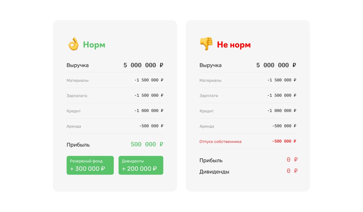 Задача — наглядно показать, что фирма заработала всего 500 000 рублей, а собственник уже потратил на себя 2 миллиона рублей со счета компании. И теперь у компании минус 1,5 миллиона, которые где-то нужно взять, чтобы заплатить за офис, купить материалы, выдать зарплаты.
