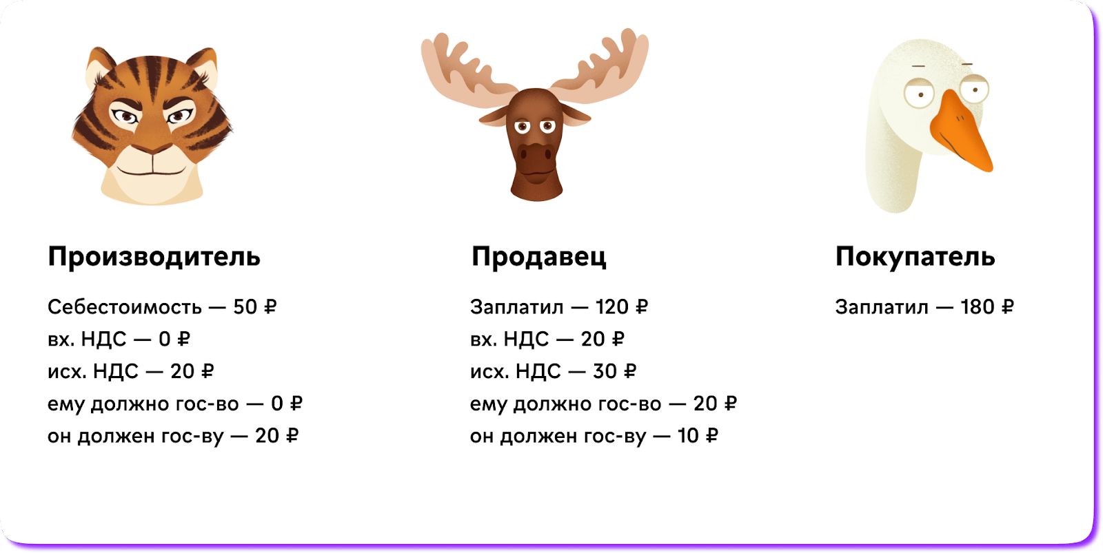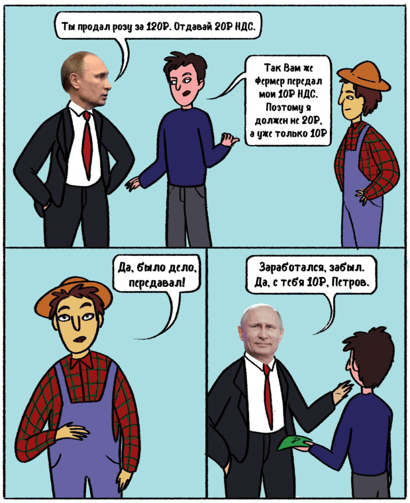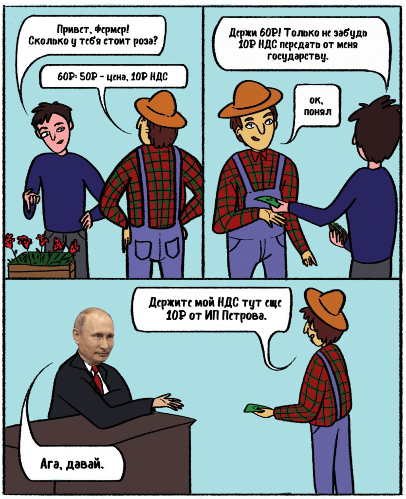 1. Когда бизнес покупает с НДС, он размазывает обязательства по его перечислению в бюджет между собой и контрагентами. Вот как это примерно происходит ↓