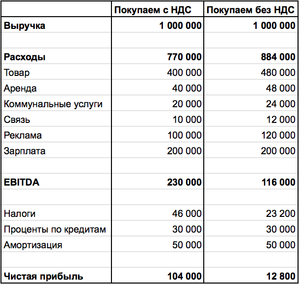 Покажем это на примере бизнеса, который перепродает товар, а новых клиентов привлекает за счет рекламы. Посмотрим, какая прибыль при прочих равных, кроме одного: суммы расходов одни и те же, но в одном случае они везде, где возможно (все, кроме зарплаты, процентов по кредитам и займам, амортизации), включают НДС, в другом — нет и получаются на 20% выше.