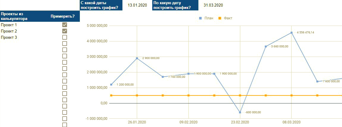 Примерочная — это инструмент, который показывает, что будет с денежным потоком, если мы согласимся на новый проект. Вводим данные из платежного календаря, заносим план по доходам и расходам — и смотрим, что будет с деньгами компании в ближайшие месяцы.