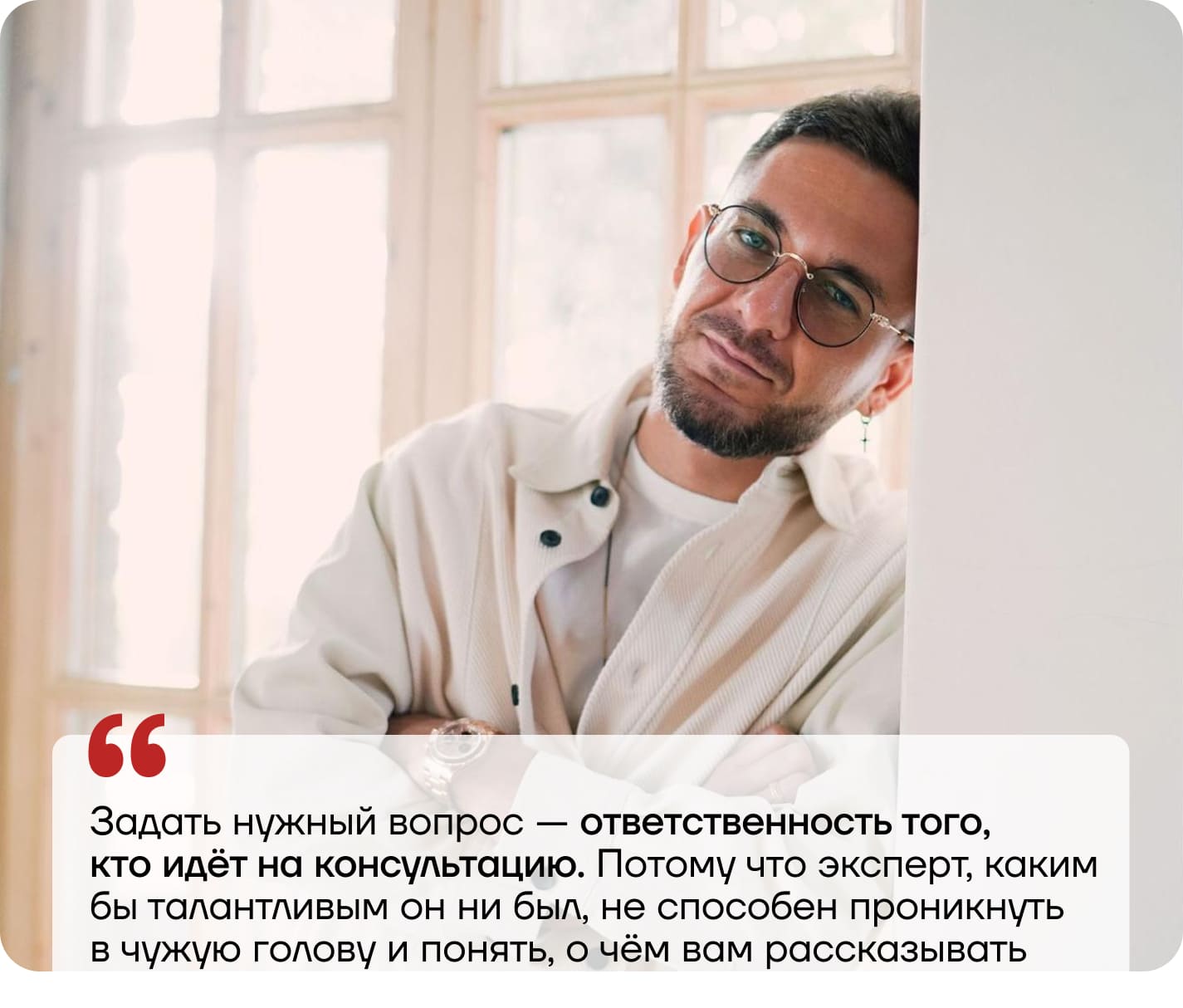 А теперь, собственно, к сути. Если вы думаете пойти на консультацию к крутому эксперту, но сомневаетесь, что не сможете воспользоваться его советами, — значит, вы просто не готовитесь к встрече. Спойлер: да, готовиться должен тот, кто задаёт вопрос. Сейчас расскажу, как.