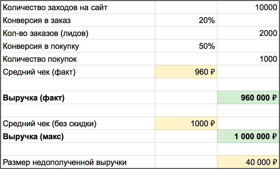 Тогда подойдет другой вариант: считать фактическую выручку с учетом скидок и гипотетическую максимально возможную — с условием, что скидок вообще не было.