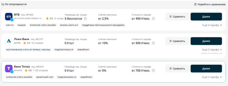 ↑ Стоимость обслуживания расчетного счета по критерию популярности банковских предложений.