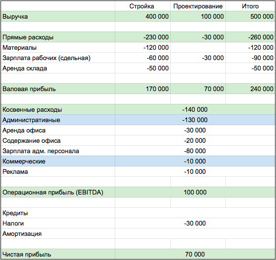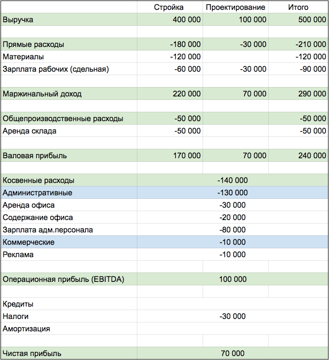 Еще можно разбить прямые расходы на переменные и постоянные (общепроизводственные). Расходы, которые не смогли разнести четко по направлениям, отнесем в косвенные. Обычно это административные расходы на обеспечение инфраструктуры в целом и коммерческие.