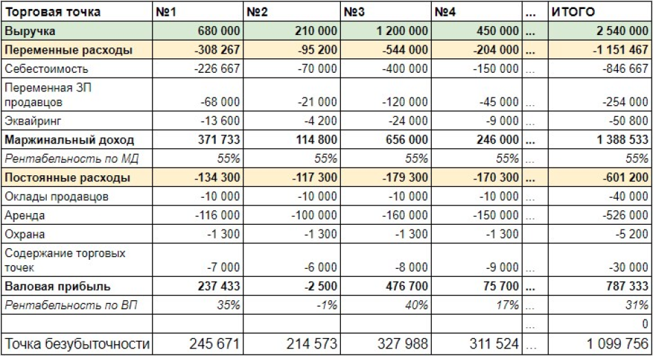 Оказалось, что есть магазины, которые приносят небольшие деньги в «хорошие» месяцы: декабрь, январь, февраль. В остальное время года эти магазины съедают прибыль торговой сети. Табличка помогла рассчитать точку безубыточности каждого магазина и составить план продаж. Собственник уже мог твердо опереться на цифры, найти наименее прибыльные магазины и разработать антикризисные меры.