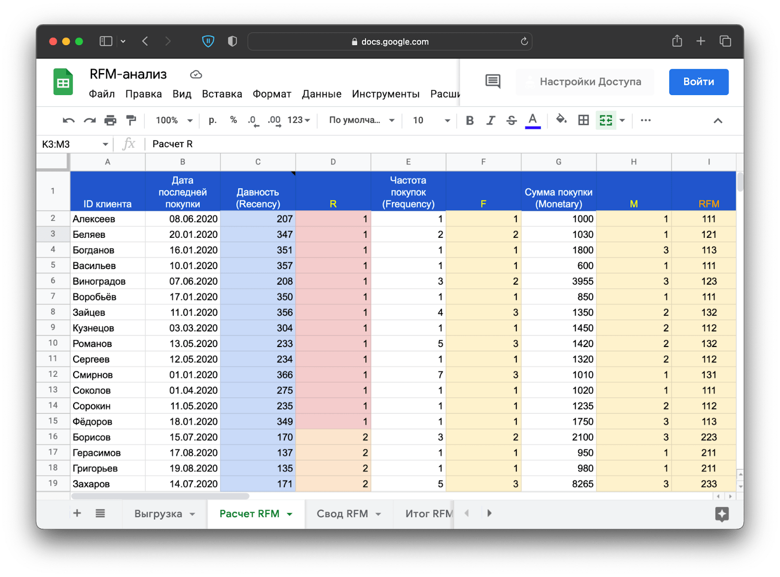 - Самая давняя дата покупки и самая свежая, или R, — в нашем случае это 206 и 95 дней.