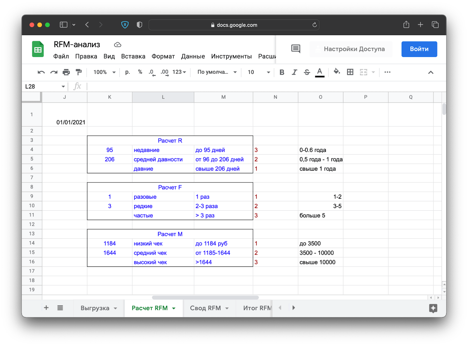 - Сумма покупок, или M, — низкий чек — до 1 184 ₽, средний — от 1 185 ₽ до 1 644 ₽, высокий — от 1 645 ₽.