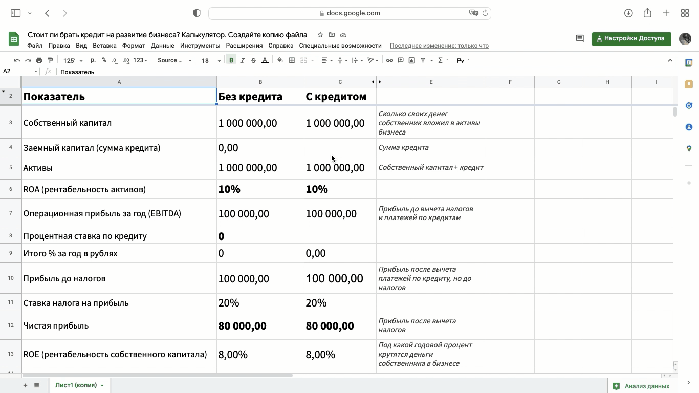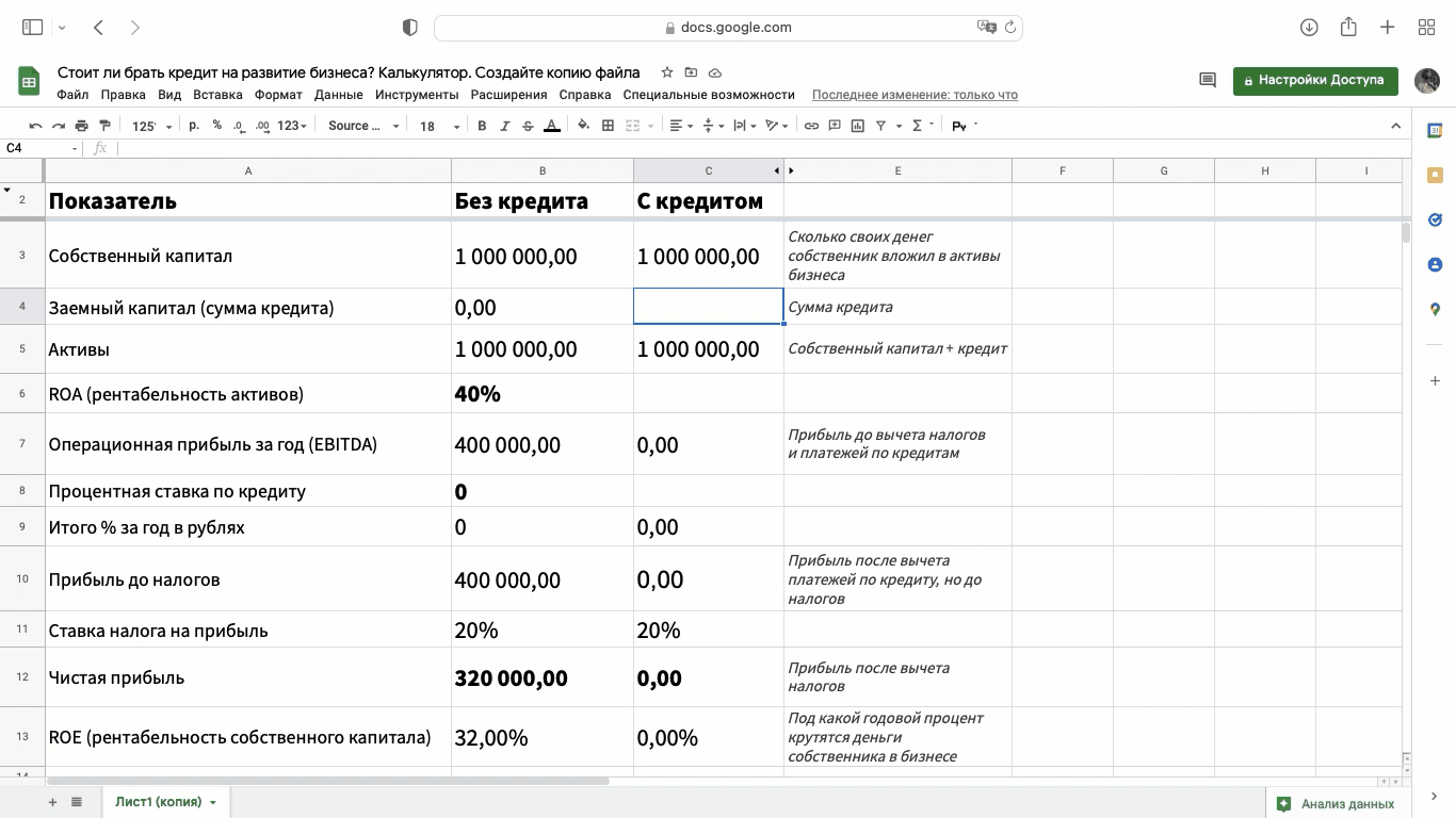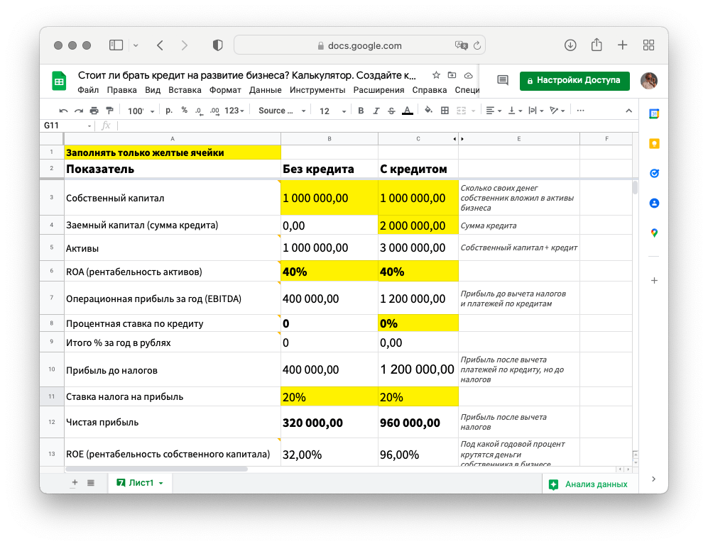 Давайте посмотрим расчеты для компании, собственник которой вложил в бизнес 1 млн рублей, работает с ROA в 40% и хочет взять кредит на масштабирование — 2 млн рублей под 15%. Заполняем ячейки: