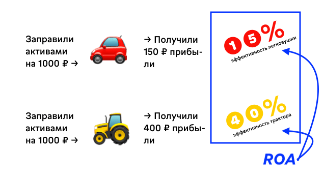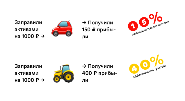 Начнем издалека. Представьте, что бизнес — это машина по производству денег, которая питается активами — деньгами, станками, техникой, недвижимостью. Предприниматель закидывает в бак машины активы, а на выходе получает прибыль. Машины у всех разные: красная легковушка генерирует 15 копеек прибыли на каждый закинутый в нее рубль, а желтый трактор — 40 копеек.