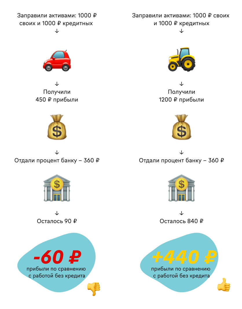 Выходит, владельцу трактора выгодно взять кредит и масштабировать бизнес на чужие деньги, а владельцу красной легковушки — нет. И дело тут не в цвете машинки, а в разнице между эффективностью и процентной ставкой по кредиту: