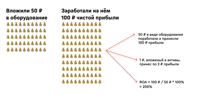 ROA показывает, сколько прибыли приносит каждый вложенный в активы рубль: