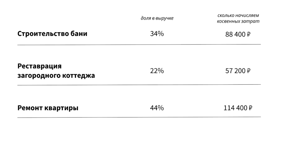 После подсчета всех затрат, включаемых в себестоимость работ, нужно распределить их по услугам компании. Для этого нужно вычислить, какой процент выручки приносит каждая.