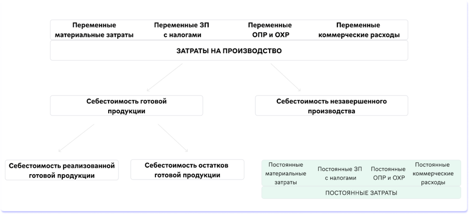 На схеме видно, что к затратам на производство относятся только переменные расходы, а постоянные вынесены отдельно.
