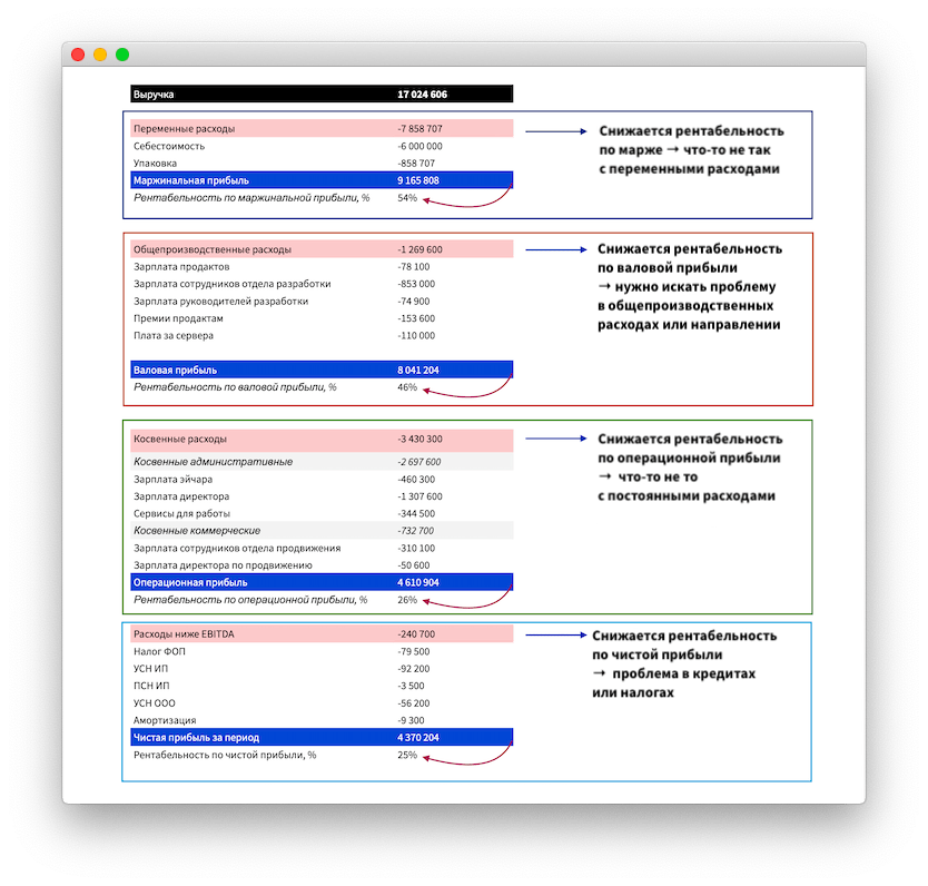 Чтобы понять, где именно проблема, нужно анализировать четыре рентабельности: по марже, по валовой, операционной и чистой прибыли. Эти рентабельности сигнализируют о проблемах на разных уровнях:
