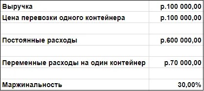 Чтобы рассчитать маржинальную прибыль с единицы, вычитаем из цены переменные затраты на единицу (на один контейнер): 100 000 - 70 000 = 30 000 рублей.