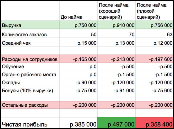Финмодель поможет рассчитать финансовый результат от найма нового сотрудника. Предположите, сколько выручки и расходов он принесет. В итоге, вы увидите, какие результаты должен показывать сотрудник, чтобы принести дополнительную прибыль компании.