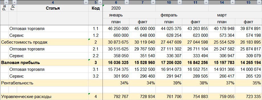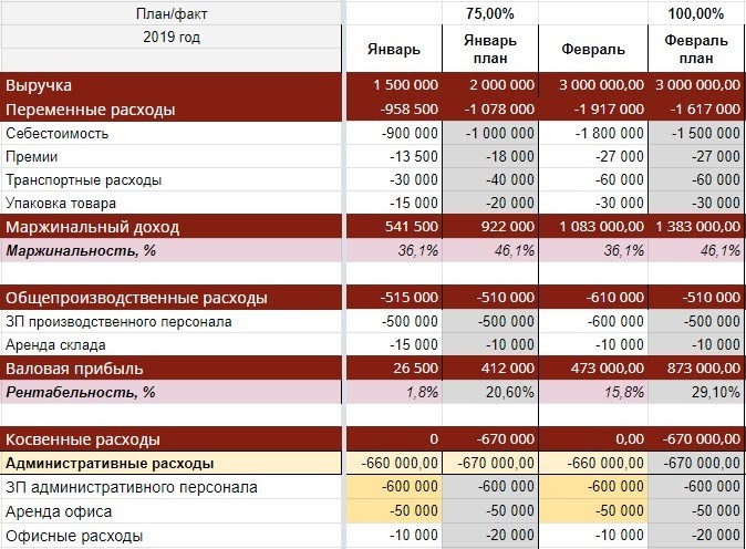 Тест на красавчика — по сути отчет о прибылях и убытках, в котором каждый месяц разбит на План и Факт. Заполняете отчет и смотрите, совпадает ли реальность с тем, что вы планировали.