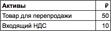 1. Итак, мы отдали поставщику за розу 60 ₽, где 50 ₽ — это стоимость розы и 10 ₽ — это НДС. Эту десятку государство теперь нам должно. На языке отчетов, мы приобрели два актива — розу и входящий НДС.