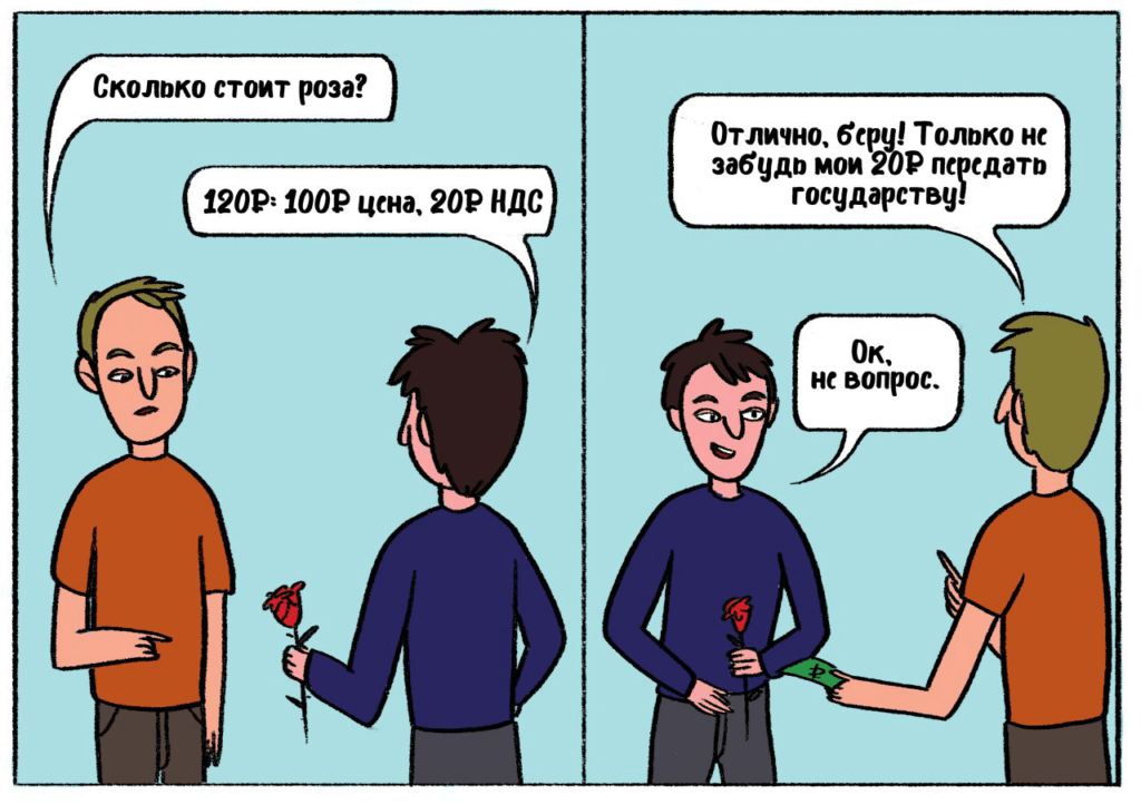А бывает и так — купили три розы на тех же условиях. Тем самым через поставщика передали Владимиру Владимировичу аванс по НДС на 30 ₽. А продали только одну — тоже за 100 ₽ + НДС 20 ₽. И когда в конце квартала к нам приходят от Владимира Владимировича и требуют у нас эту двадцатку, мы отвечаем: «А ни фига, уважаемые! Мы в Кремль аж 30 ₽ аванса передали через фермера. Помните? А через нас покупатель передал 20 ₽. Так что не мы вам 20 ₽ должны, а вы нам 10 ₽. Поэтому или пусть эта десяточка у вас полежит — в следующем квартале сочтемся. Или гоните ее назад, а следующий квартал начинаем с нуля — у нас такое право тоже есть». Выслушали нас гонцы, бумаги подняли, посчитали. Убедились — мы правы. И пошли восвояси.