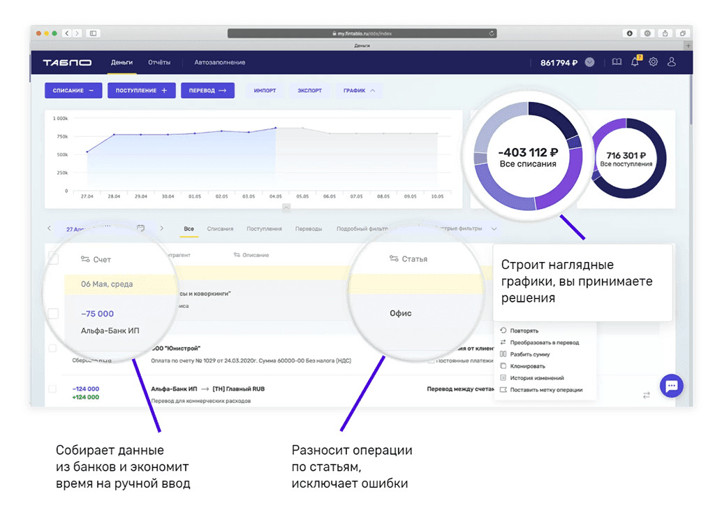 Финтабло — сервис, ориентированный на малый и средний бизнес. Помогает автоматически загружать банковские выписки и разносить операции по статьям, формировать ключевые отчёты в пару кликов.