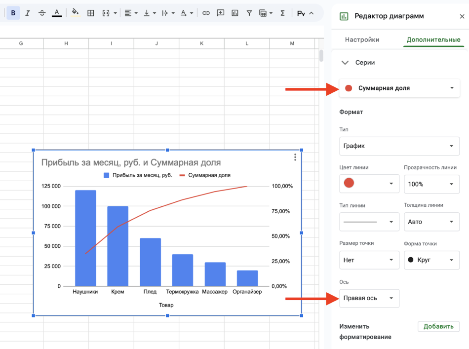 Потом надо перейти в дополнительные настройки диаграмм и сделать ещё несколько кликов в разделе «Серии». Поменяйте настройки, как это показано на картинке. Ключевое здесь: для суммарной доли сменить ось с левой на правую. Только так отображение диаграммы будет верным.