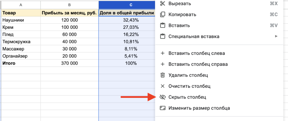 Шаг 2. Скрыть третий столбец. Он нам не понадобится — он нужен был только для расчёта суммарной доли.