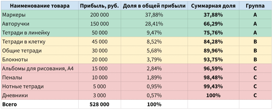 Если бизнес не настроен эффективно, то товаров из категории С, или аутсайдеров, может быть много. Такие товары будут занимать значительную часть ассортимента, но приносить минимальный доход.