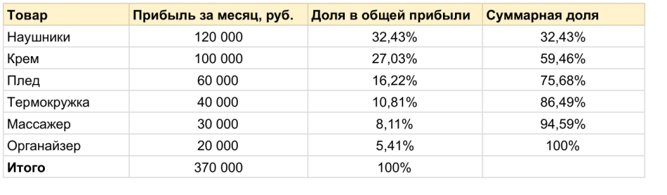 доля в общей прибыли — процент прибыли от товара по отношению к общей прибыли. Если решили взять за основу не прибыль, а выручку, то также используйте её и тут;
