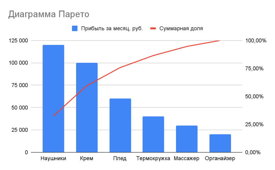 Представьте, что это данные продавца на маркетплейсе по всем его товарам: наушники дают 120 000 ₽ прибыли, крем — 100 000 ₽, пледы — 60 000 ₽ и так далее по убыванию. Если смотреть на диаграмму слева направо, первый столбец будет самым прибыльным товаром.